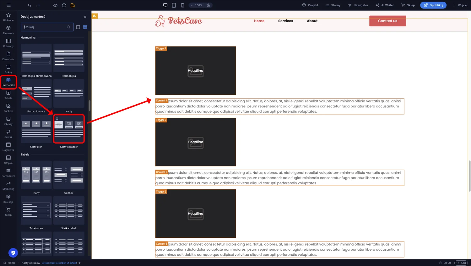 Do rozwijania zawartości akordeonu możesz używać różnych komponentów. Zamiast nagłówka możesz wykorzystać również obraz. W takim przypadku przydatnym elementem do dodania na stronę będą Karty obrazów.