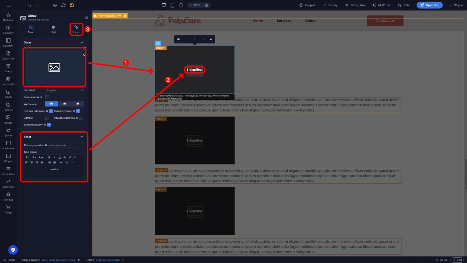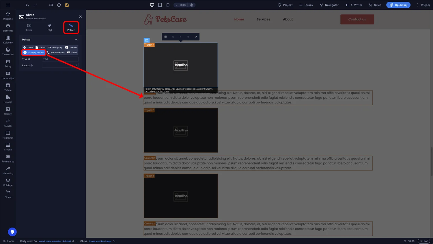 Trigger to przycisk akordeonu zawierający nagłówek. Nagłówki, podobnie jak inne elementy, mogą służyć jako odnośniki do stron internetowych, plików lub innych elementów – w tym przypadku do zawartości akodeona. Trigger możesz dostosować, zmieniając ustawienia w lewym panelu po dwukrotnym kliknięciu.