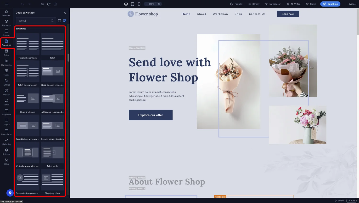 Aby dodać kafelek z treścią kliknij na ikonę Zawartość w lewym panelu bocznym. Wyświetlone zostaną dostępne układy do wyboru. Teraz wystarczy przeciągnąć wybrany element na żądane miejsce na stronie.