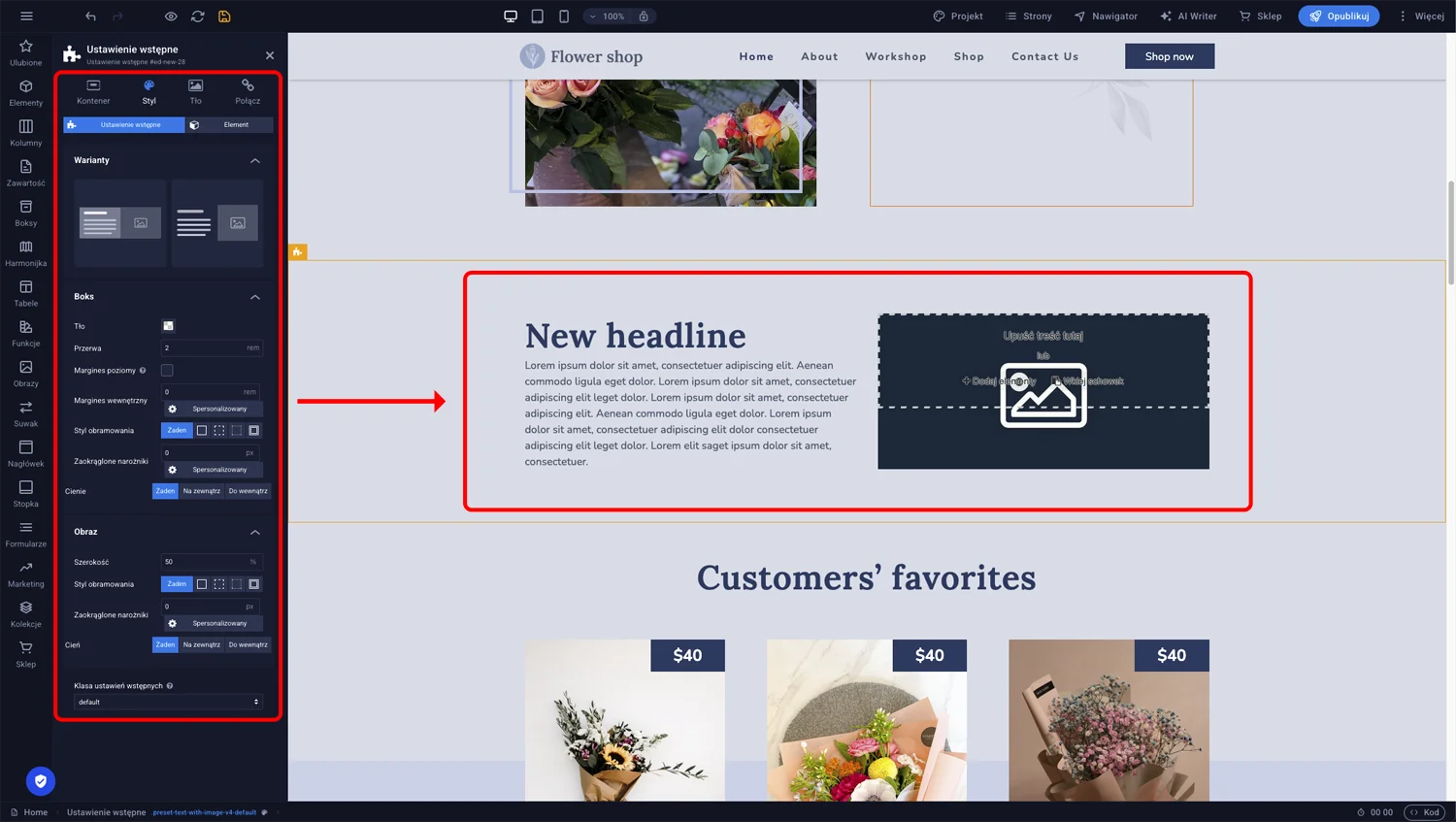 Po dodaniu kafelka z treścią i dwukrotnym kliknięciu na nim w głównym oknie edytora otworzy się panel z ustawieniami. W zależności od wybranego układu można w tym miejscu zmienić jego wariant, ustawić odstępy od pozostałych bloków czy dopasować szerokość kolumn, z których się składa.
