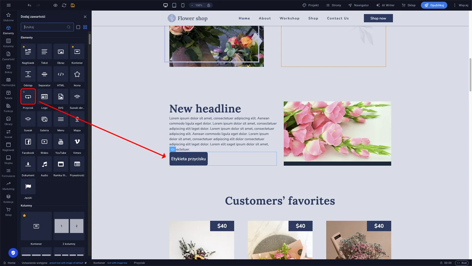 Oprócz wpisania własnej treści do predefiniowanego bloku, Sitejet Builder daje również możliwość dodania lub zmiany elementów, z których składa się taki kafelek. Na przykład, aby dodać przycisk pod tekstem w lewej kolumnie kafelka wystarczy kliknąć ikonę Elementy w lewym panelu bocznym, wybrać Przycisk i przeciągnąć go w wybrane miejsce strony. Miejsce umieszczenia przycisku sygnalizowane będzie zieloną linią.