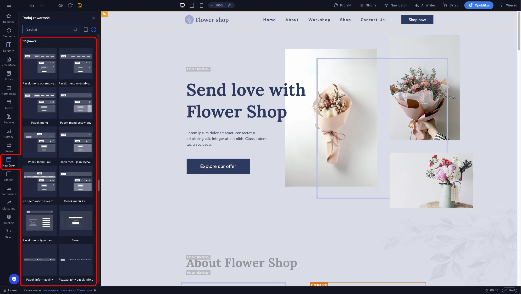 Jeśli chcesz dodać menu na nowej lub pustej podstronie – albo skorzystać z innego układu menu – możesz wybrać jeden z gotowych nagłówków dostępnych w kategorii „Nagłówek” (Header) na lewym pasku bocznym. Wybierz interesujący Cię układ i przeciągnij go do głównego okna edytora.