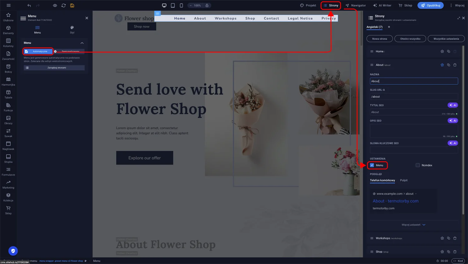 Jeśli tworzenie swojej witryny rozpoczynasz od zaimportowania jednego z gotowych szablonów, nagłówek i menu będą już w nim dodane. Jedyne co musisz zrobić, to dostosować go do treści swojej witryny.