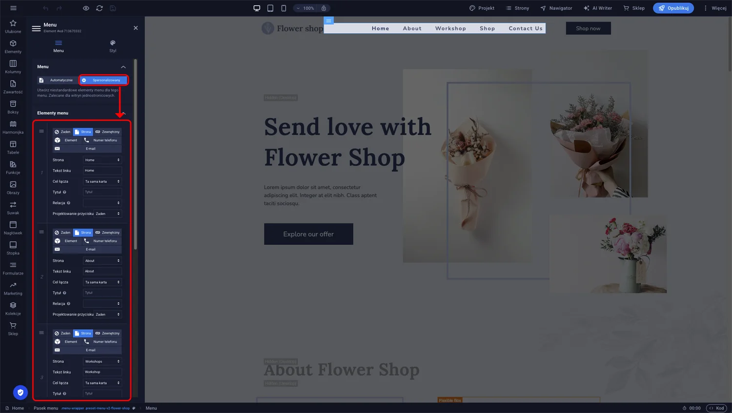 Po dodaniu sekcji nagłówka możesz dwukrotnie kliknąć element menu, aby otworzyć panel ustawień. Tutaj możesz zdecydować, czy menu ma zostać utworzone automatycznie (opcja Auto), czy chcesz skonfigurować je samodzielnie – Spersonalizowany (Custom).