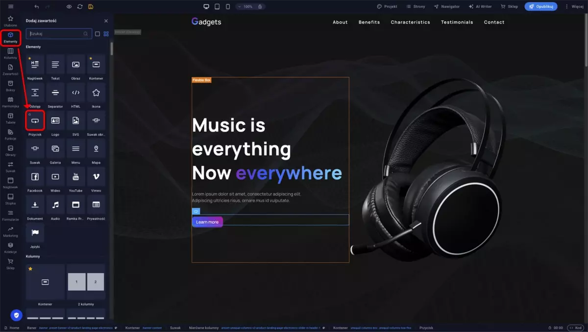 Przyciski to istotne elementy strony, które pozwalają przekierować użytkownika w konkretne miejsce witryny lub na stronę zewnętrzną. Aby dodać taki element w edytorze Sitejet Builder należy kliknąć ikonę Elementy w lewym panelu bocznym, wybrać Przycisk i przeciągnąć go w żądane miejsce na stronie.