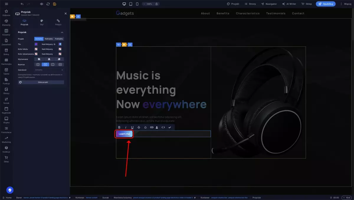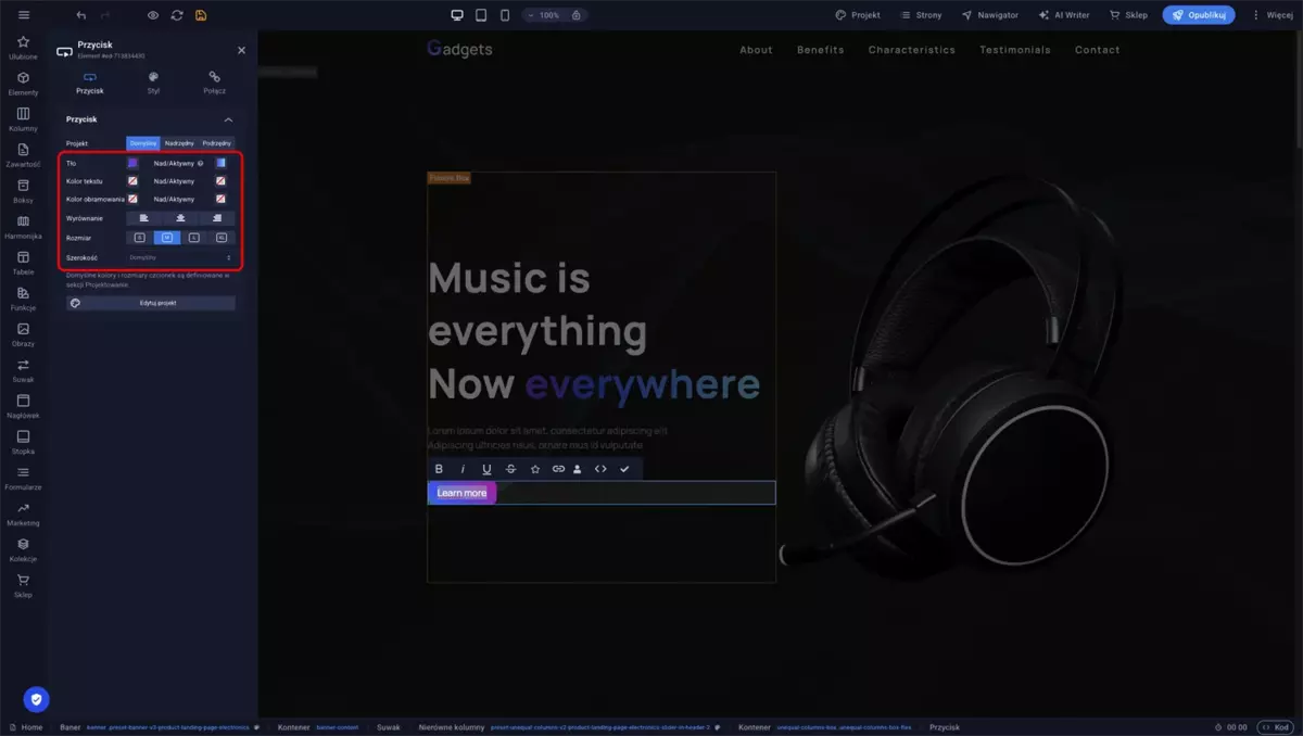 Dwukrotnie kliknij przycisk w edytorze, aby otworzyć panel ustawień. W prawej kolumnie znajdziesz opcje dla stanu hover — możesz zmienić kolor tła, kolor tekstu, obramowanie i zaokrąglenie narożników. Efekt hover pokazuje użytkownikowi, że element jest klikalny, co poprawia doświadczenie korzystania ze strony.