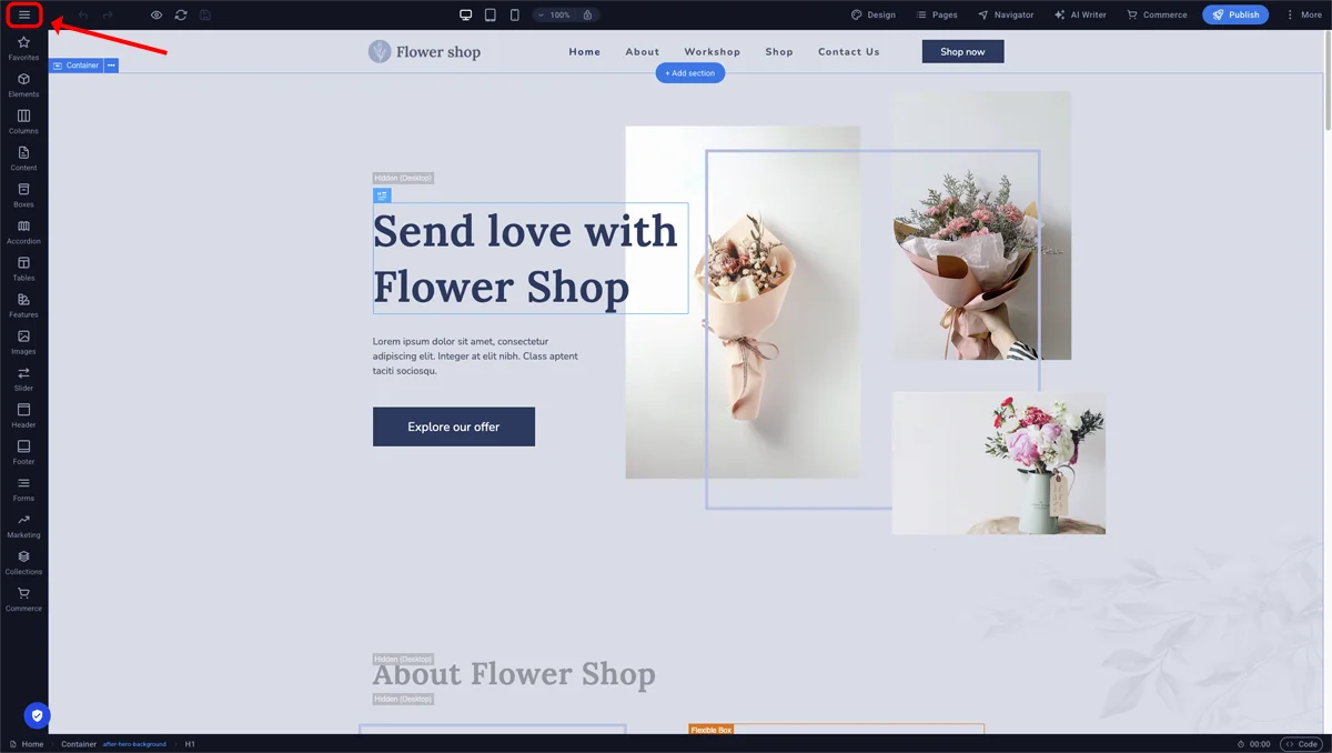Tryb Jasny wymusza jasne tło interfejsu. To dobre rozwiązanie, gdy zależy Ci na jak najwierniejszym odwzorowaniu kolorów projektowanej strony. Większość stron internetowych wyświetla się na jasnym tle przeglądarki, więc jasny motyw edytora daje najbliższe rzeczywistości warunki pracy. Ten tryb sprawdza się szczególnie dobrze przy dopracowywaniu kolorystyki marki, tworzeniu grafik i dobieraniu odcieni tła sekcji.