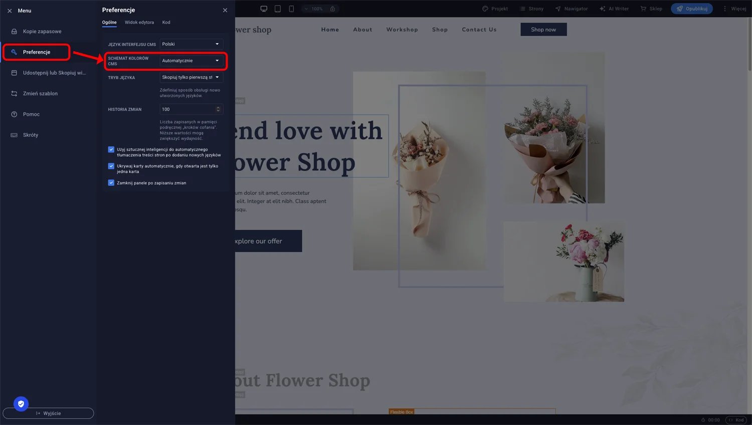 Następnie należy wybrać pozycję Preferencje -> Schemat kolorów CMS. Rozwijane menu w tym miejscu zawiera 3 opcje: Automatycznie (ustawienie domyślne), Ciemny i Jasny.